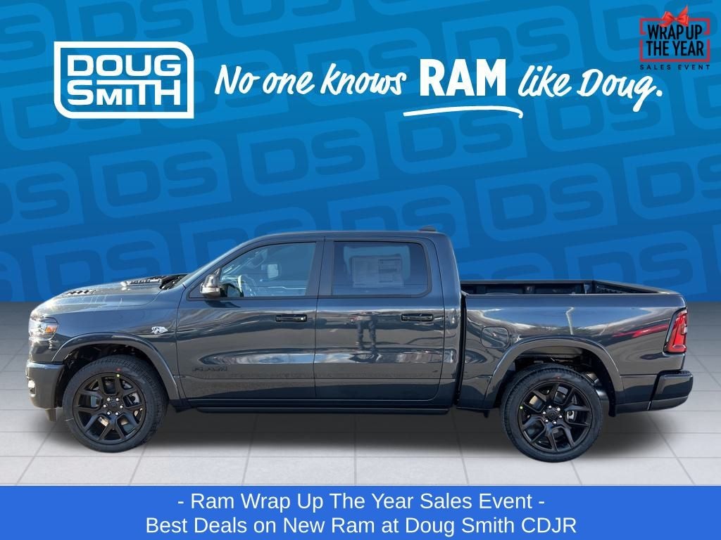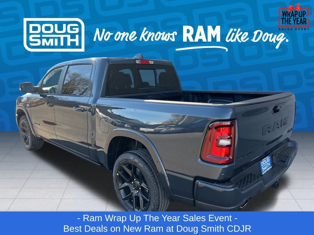 Forged Blue Metallic 2026 Ram 1500 Laramie 4WD 8-Speed Automatic HEMI 5.7L V8 Multi Displacement VVT eTorque Price includes: $3500 - 2026 National Retail Consumer Cash . Exp. 01/05/2026 - Sale Price Includes: $1,500 Trade-In Allowance Incentive Program for customers that trade in a 2015 or newer passenger vehicle with 100,000 miles or less. - Offer Exp. 01/31/2026 - See Doug Smith CDJR for full details. - Advertised Price reflects a $1,500 Financing Discount. To qualify for this discount, customer must secure credit approval and finance with a dealership lender. Cash purchases or outside financing will void the discount, increasing the final price by $1,500. Exp. 01/31/2026 - See Doug Smith CDJR for full details.