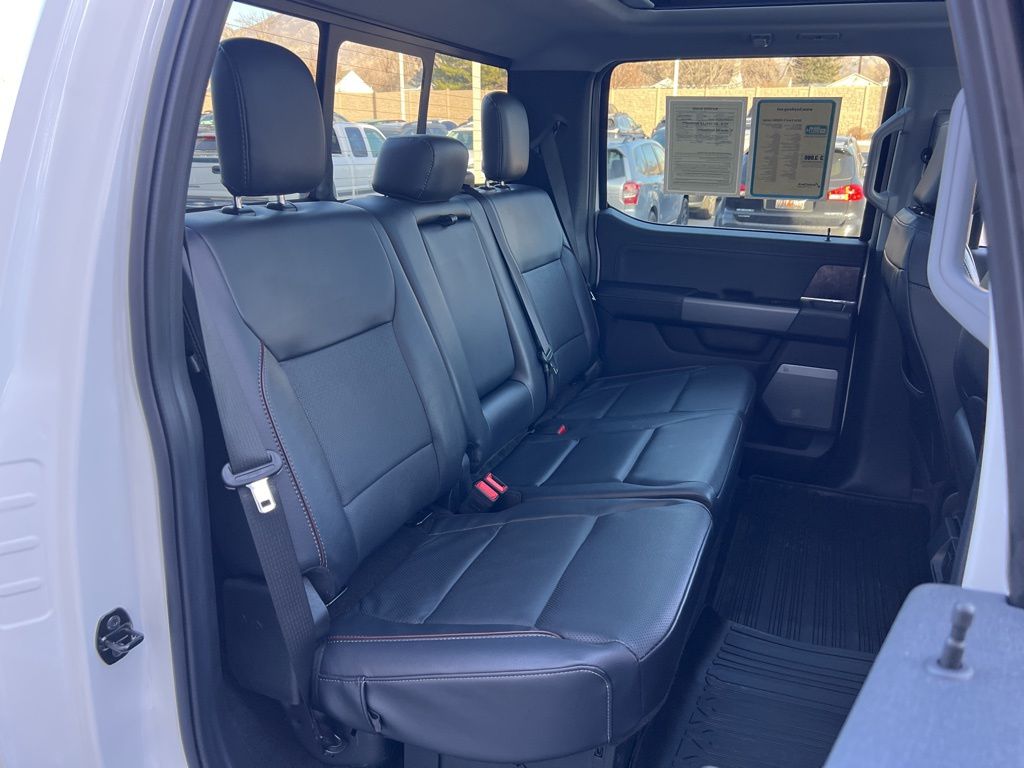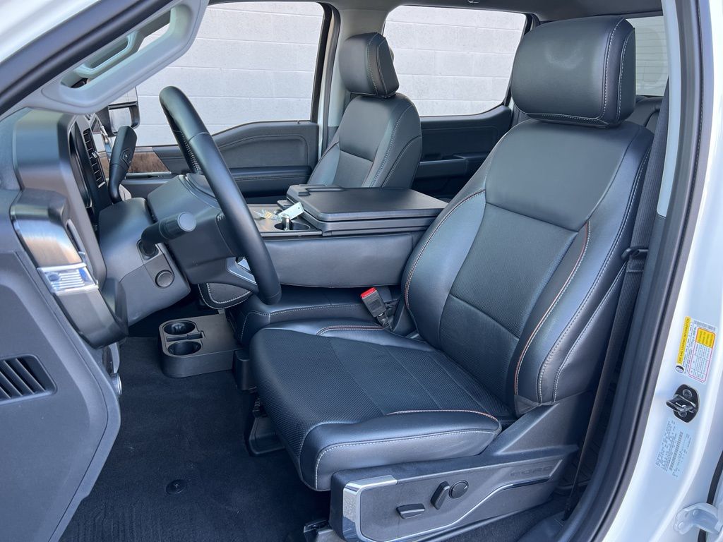 Elevate your driving experience with the Lariat's luxurious interior, including heated and ventilated leather-trimmed front seats, a heated steering wheel, and a convenient interior work surface. The Tough Bed spray-in bedliner and retractable bed steps ensure your cargo is secure and easily accessible.